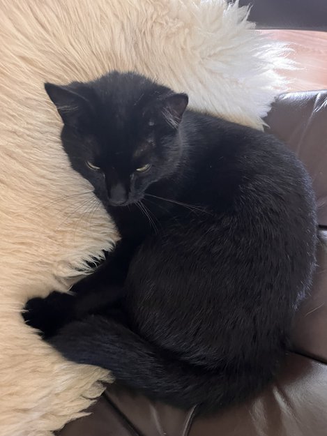 Hun er sterilisert og id merket. Hun er liten til tross for at hun er 2 år og helt svart. Har kun 15 hvite hårstrå på halsen, men de syns knapt.