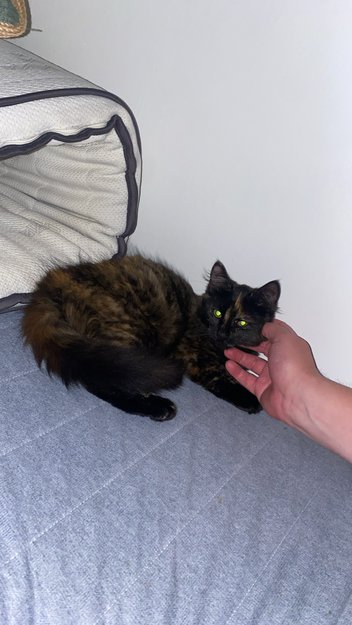 Spraglete, langhåret, leken og litt kosete. Dette er en villkatt så ikke prøv å gå til henne, helst ring meg.