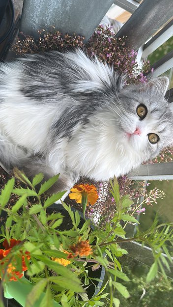 Katten er grå og hvit, lang pels. Grønne/honning farget øyne, med rosa nese.