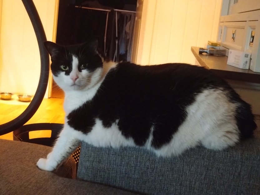 Leo er en litt lubben sort og hvit hu katt, hu er veldig veldig skeptisk til menn og ikke serlig glad i nye ting. Leo er også veldig glad i kos og mat.