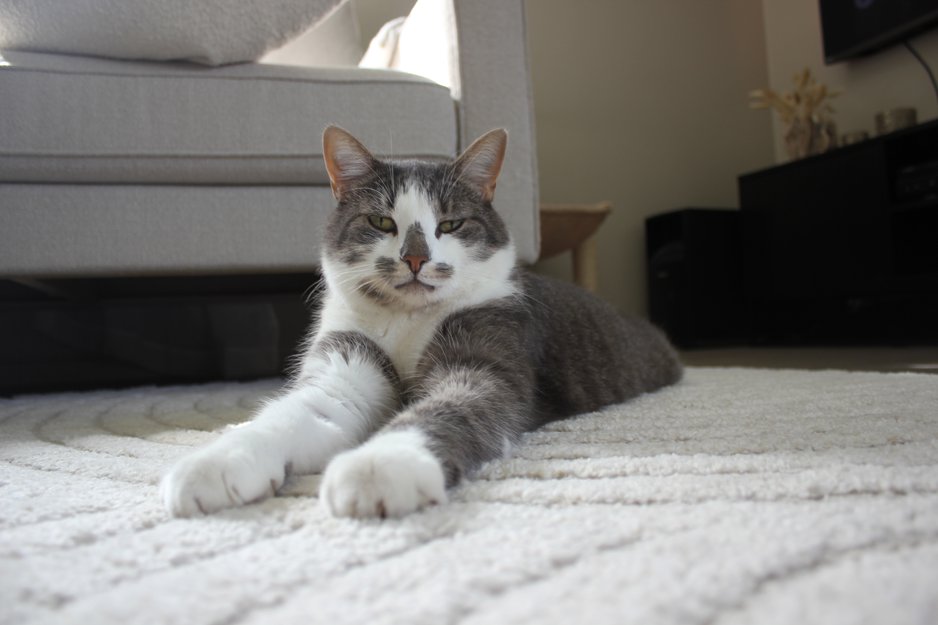 En labb som er hvit og en labb hvor kun poten er hvit og resten grå. Han er grå på kroppen og halen. Han har også ett lite arr på øret, hvor det ikke er hår. Han er en relativt stor katt på ca 8kg.