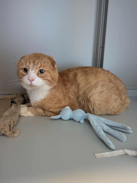 Rød og hvit, hvitt neseparti og hals. Har "blomkål"-ører, trolig en medfødt misdannelse.