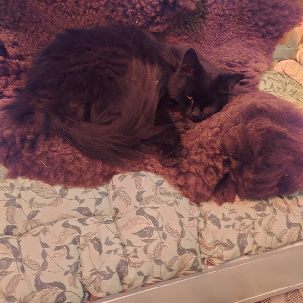 En helsvart langhårete katt snek seg inn mens verandadøra stod åpen og spiste av kattematen til min egen katt. Nå har katten "bosatt" seg på verandaen. Den er chippet, men eieren som står oppført, døde for 2 år siden. Er det noen som savner Pusy?