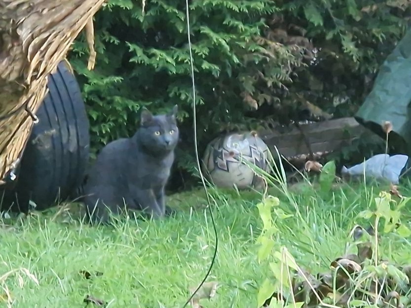 En ung katt har løpt ut og er savnet. Han er bare noen måneder gammel, helt grå med gule øyne (noen sier lisegrå, andre mørkegrå).