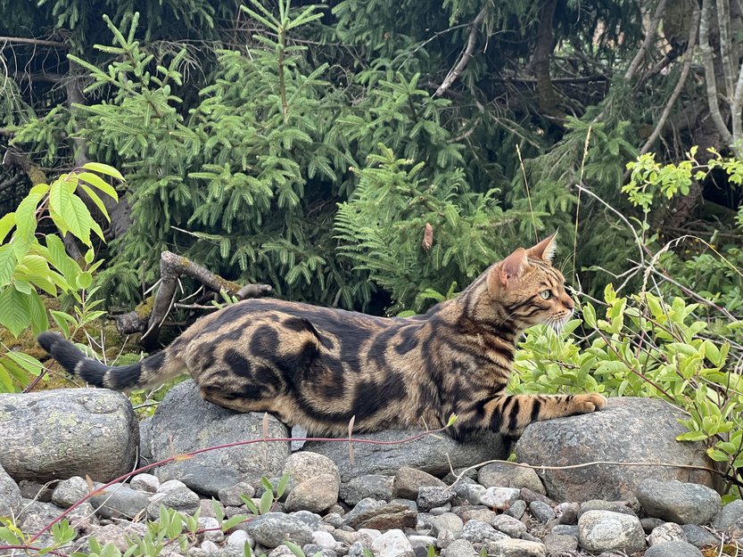 Ung katt gutt 1,5 år egen katteluke, sjelden vekk mer enn noen timer. Hjemmekjær og mammadalt. Forsvant i løpet av mandag 21.sept fra hjem på Yven. Blanding bengal og Maine Coon.