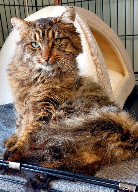 Oppdaget i juli 2025. Var da veldig redd, hadde tovete pels og en skade på halen. Etter flere uker med mating og forsøk på å få han inn, ble han levert til Dyrebeskyttelsen Lillestrøm og omegn hvor han er nå.