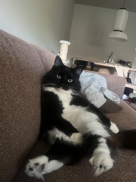 Langhåret sort og hvit katt, hvite poter, mage og hals - sort ellers. Liten hvit flekk på leppa rett under nesa.
