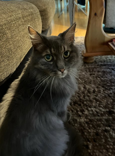 Grå (med ulike nyanser grå), langhåret katt. Da han har hatt floker før har han blitt klipt så derfor litt ulik lengde på pels. Rosa nese. Mangler høyre fortann oppe. Har små kutt ytterst på øretippene. Gule øyne.