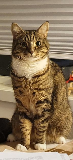 Hermine veier ca 4kg, hun har hvit krage og hvite poter. Hun er chippet.