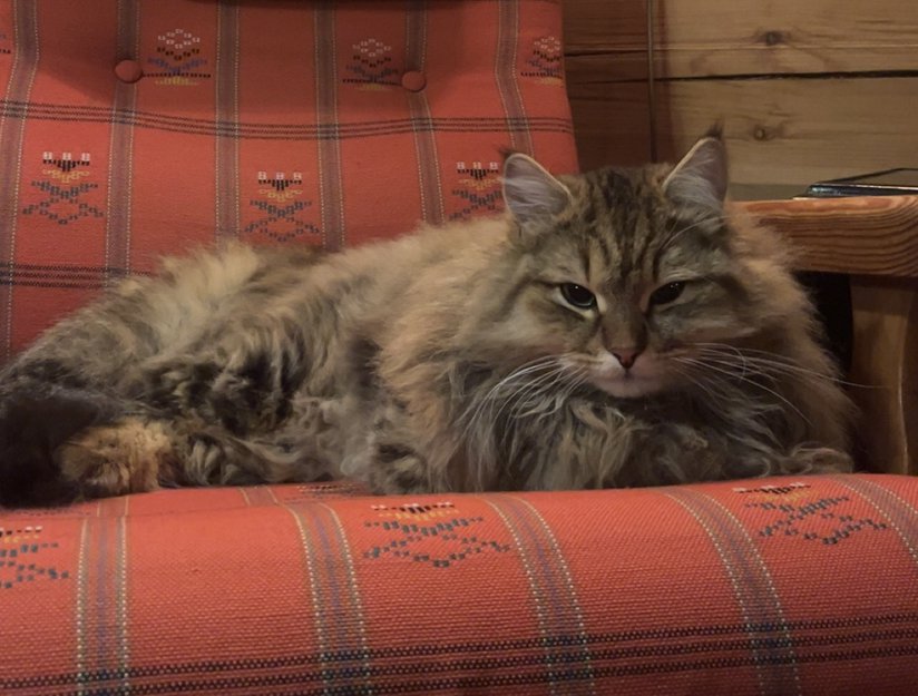 Langhåret, brunspottet. Veldig sosial og kjærlig katt. Lyder navnet sitt.
