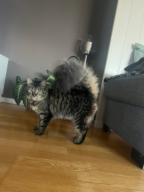 Hun er en veldig liten katt, men har en stor og fluffy hale. Hun er veldig kjelen, men redd for alt som er nytt.