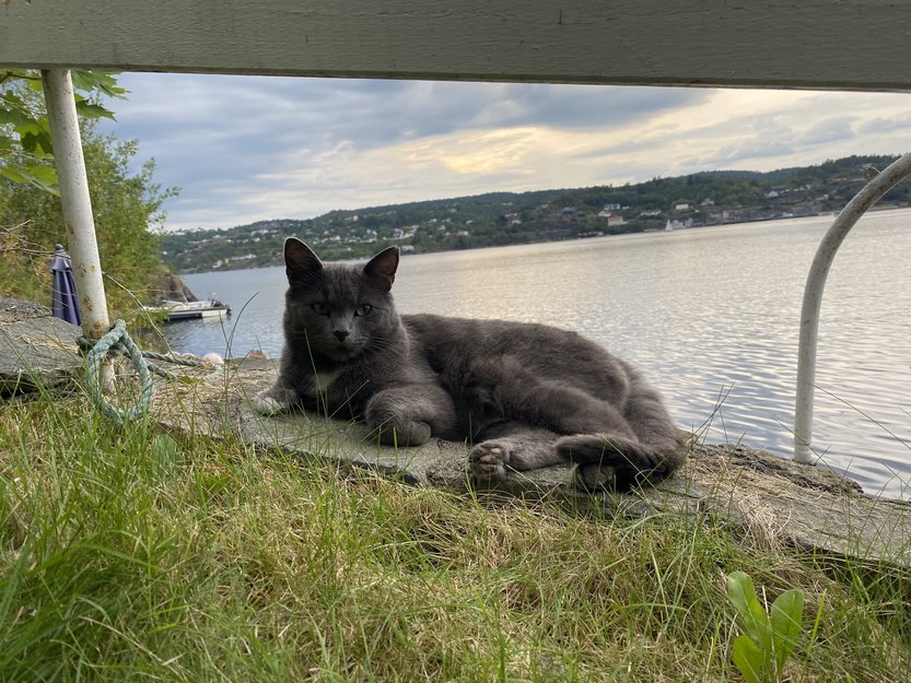 Grå, myk pels. Hvitt merke på halsen og på den høyre forpoten. Nysgjerrig og pratsom.