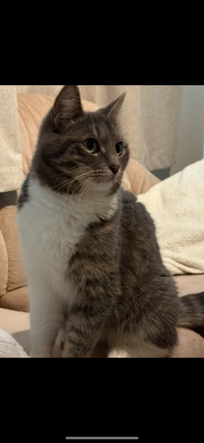 Grå stripete pels med hvitt på bryst og helt hvit høyre pot.