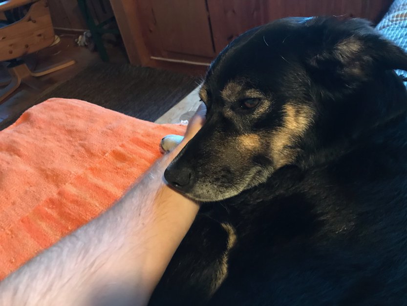 Eg slapp bandet hennar på veg opp oppkøyrselen etter tur. Når eg snudde meg hadde ho stukke av. Ho har halsband på og band.