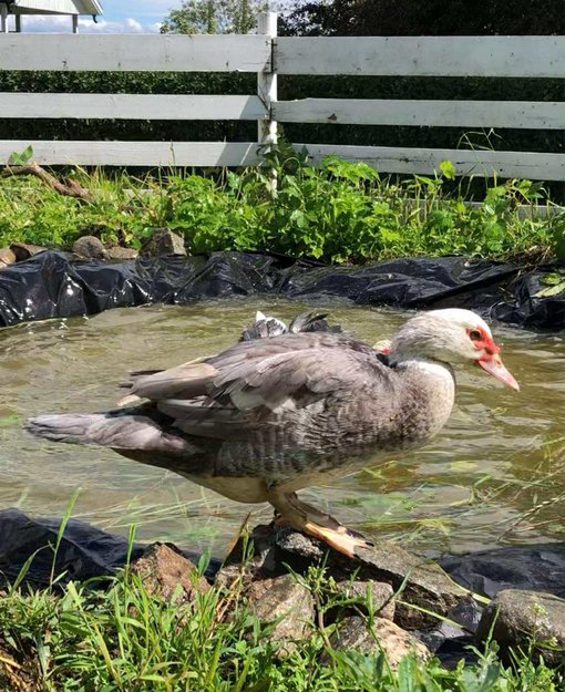 Lola er en grå og hvit moskusand, ca 40 cm høy. Kommer gjerne bort til deg hvis du har noe mat men liker ikke å bli tatt på eller plukket opp.