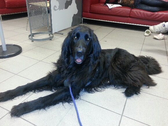 Sort ensfarget lang pels. Kraftig hannhund, antagentlig kastrert. Dette er en hund som har ett herlig lynne. Antar alderen til ett sted mellom 5 - 7 år.