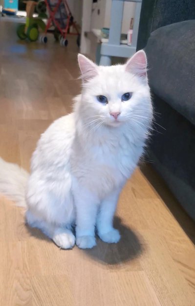 Katten har semilang hvit pels, lyse blågrå øyne og rosa nese.