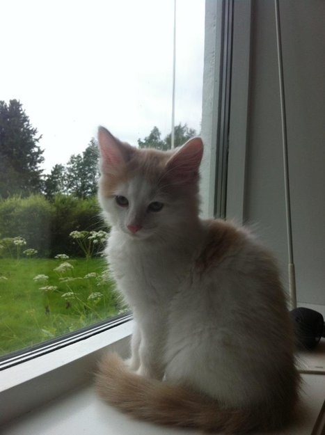 Råkky er fremdeles ganske liten, bare 5 mnd gammel. Han har litt lang pels som er mest hvit, med orange på hodet, ryggen og halen. Han er svært tillittsfull og glad i folk. Han har ikke noe halsbånd.