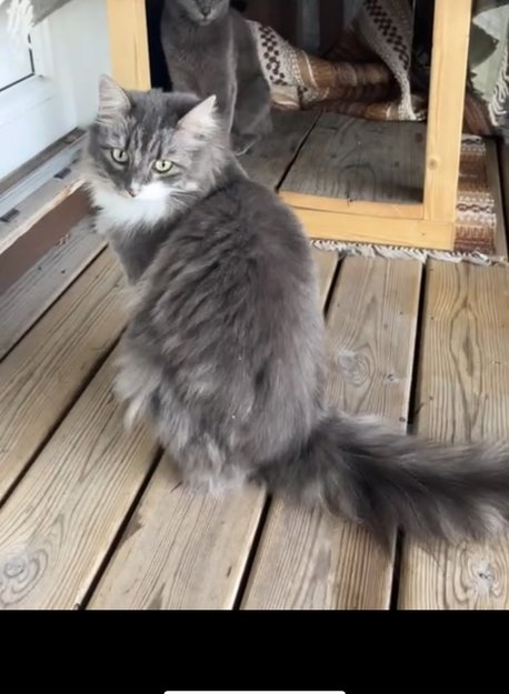 Hun er grå med noen lysere striper på ryggen, hvit under nesa og på brystet. hun har hvite labber og hvit pels på magen. hun er skipskatt og har kraftige poter.