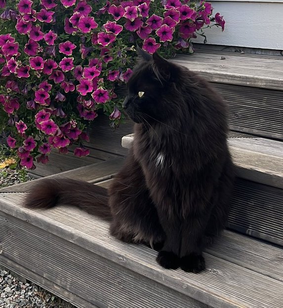 Svart, langhåret katt med en liten hvit flekk på brystet.
