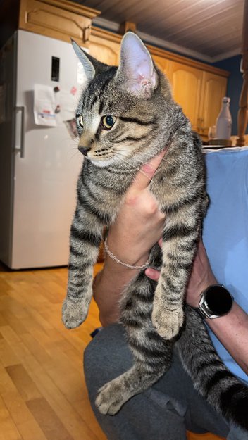 Kom noen på døren fordi en katt hadde fulgt etter dem lenge på tur. Da de ringte på løp den rett inn. Vi trodde det var nabokatten , men så da at det var en kattunge/ung katt. Ser ukastrert ut og desverre ingen chip. Men er renslig og ikke redd våre katter så har garantert et hjem.