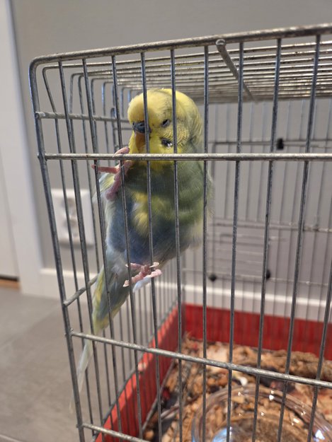 Kjempesøt undulat funnet ute. Ser fin ut i fjærene og kvitrer av og til, og får inntrykk av at den er vandt til mennesker. Får mat, vann og selskap inne.