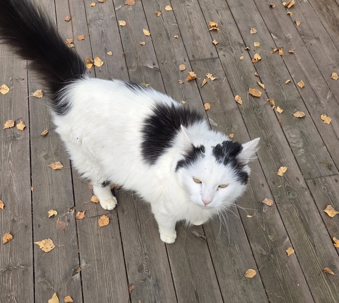 Hvit og sort med lyse øyne. Mjauer uten lyd.