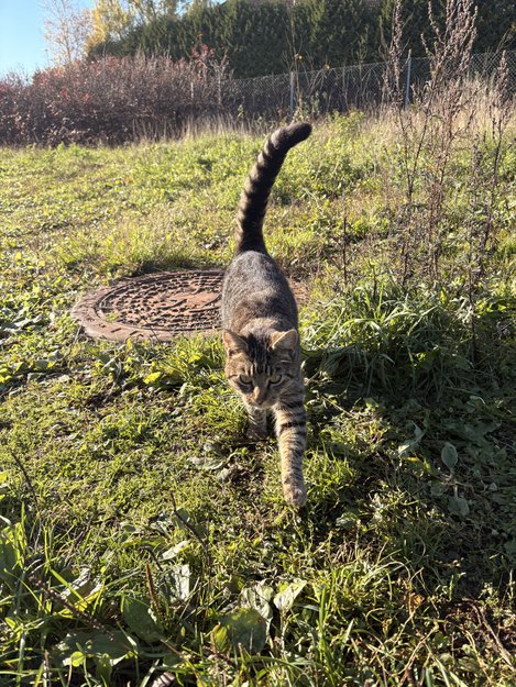 Ikke sett katten i området tidligere. Kontaktsøkende. Så ut til å varme seg på et kumlokk. Makrellbekken T-bane stasjon.