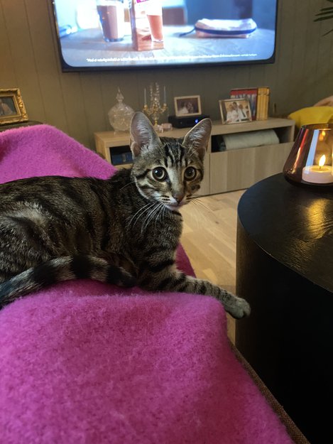 Litt skvetten ved første møte, men raskt tillitsfull, nysgjerrig og kosete.