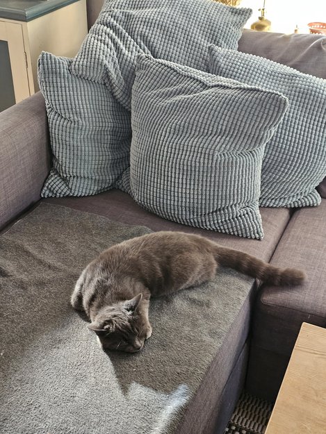 Katten er korthåret og grå i pelsen. Den har gulbrune øyne. Ikke helt fullvoksen. Syv måneder gammel.