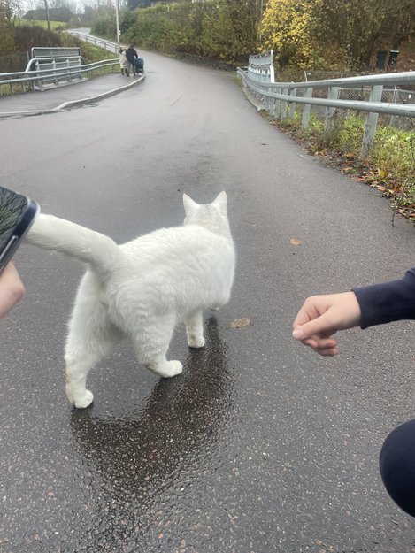 Vi fant en hvit vannkanon med et grått V-merke på hodet han fulgte oss over 2-km både til butikken og tilbake hjem nå sitter han utenfor blokken vår og venter på oss