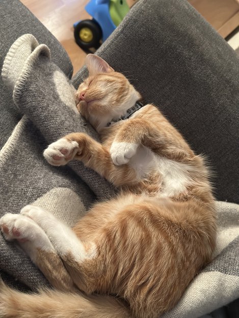 Han har en liten hvit flekk midt på nesa. Fint tigermønster nedover halen. Veldig tillitsfull, nysgjerrig og sosial.