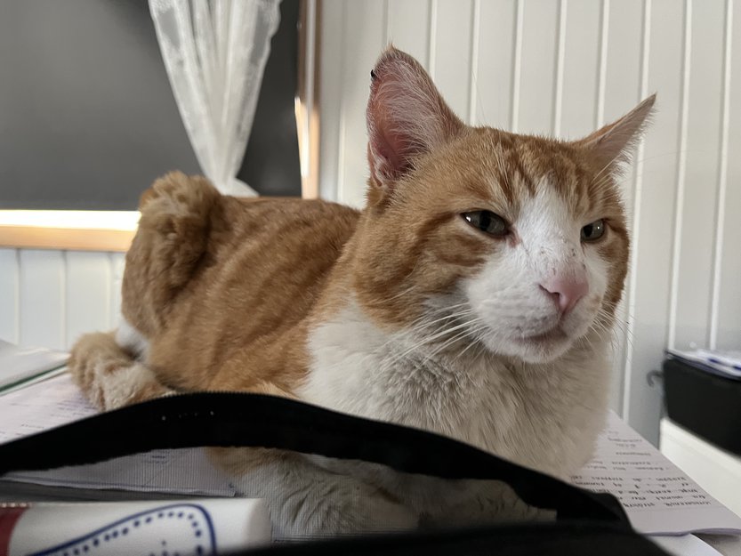 Han er oransje og hvitt. Det er en relativt stor katt. Grønne øyner.