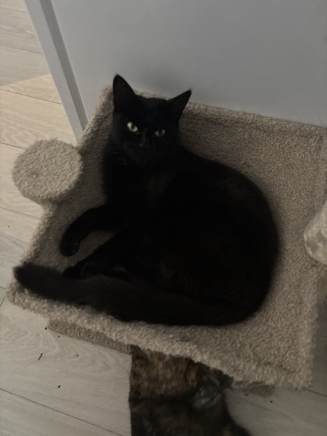 Nesten helt svart utenom et hvitt parti på brystet. Omtrent 1 år gammelt, ikke chippet men veldig snill blandt mennesker.