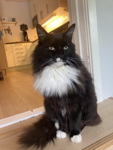 Svart og hvit langhåret. Litt forsiktig av seg, men nysgjerrig hvis du setter deg ned. Pratsom og lyder navnet sitt.
