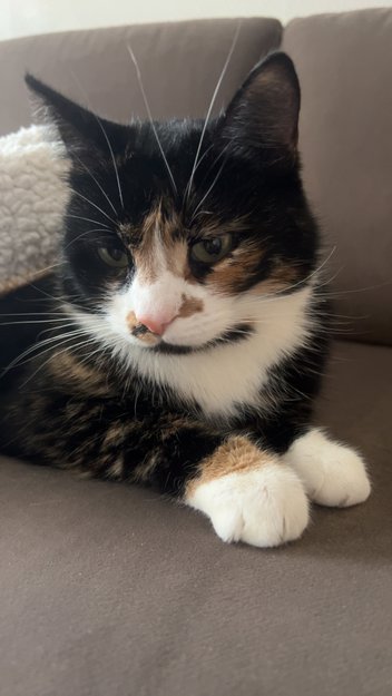 1 brun flekk på hver side av nesen, den ene med en svart strek i. Hun er ganske lav å lager lite lyd.