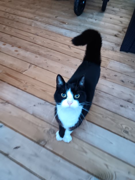 Katten er veldig kosete og tydeligvis vant til folk. Den holder til i hagen vår på Falkum og vil inn, virker som om den er mer innekatt. Vi kan dessverre ikke slippe den inn på grunn av allergi.