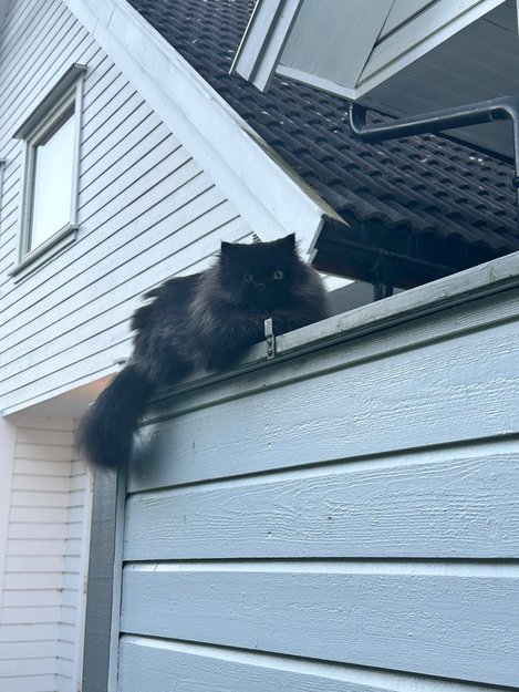 Svart perserkatt, 2 år gammel. Han liker å mjaue til mennesker, men liker ikke å bli tatt på. Han har mest svart pels, men magen er svart/grå. Ansiktet er flatt slik som mange perserkatter har. På høyre side har han et arr etter en tømt byll – han ble angrepet av en annen katt i nabolaget for noen dager siden, og vi tok ham til veterinæren. Han har allerede fått antibiotikao og må få neste dose nå, og området rundt høyre pote er barbert på grunn av behandlingen.