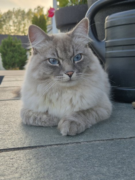 Han er langhåret, hvit med grå tegninger og har blå øyne. Han er kastrert og chippet.