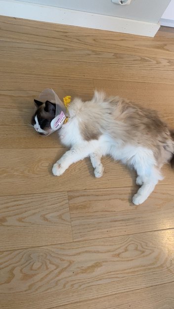 Katten vår smatt ut døren etter han hadde kommet hjem fra dyrlegen. Har krage på og er skadet i kinnet.