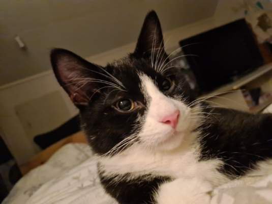 3år,chippet og kastrert.Hvit krage og hvite sokker på alle bein.