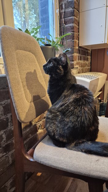 Hun er en typisk tortie, med stor personlighet. Hun er 5kg og ser god og rund ut. Hun høres ut som en litt hes kråke når hun mjauer. Er lettskremt men også veldig tillitsfull.
