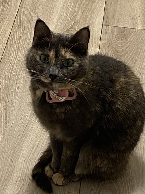 En fin katt kommer inn på terrassen vår hver natt. Den har rosa halsbånd. Opplysningene der er ikke lenger kesbare.
