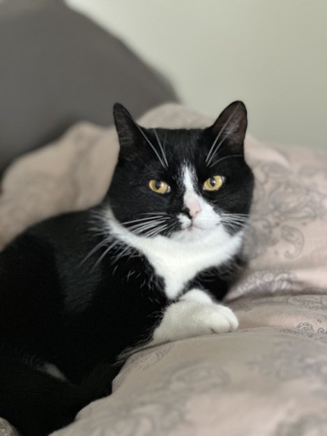 Sort og hvit, og med 4 hvite poter. Sterilisert og chippet. Lyder navnet Oreo.