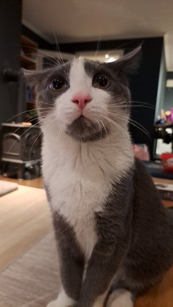 Grå og hvit katt. Hvite poter. Grå hake utenom en liten hvit flekk.
