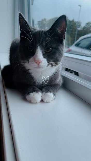 Den grå katten har glatt pels, en mage og nakke som er litt hvite, potene hans er også hvite, som om han har på seg sokker, og på den ene poten er det en flekk som ser ut som en skitten flekk, og nesen hans har et arr fra en slåsskamp med broren.