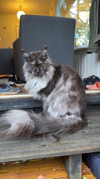 Hun er en ganske stor og rasetypisk Maine Coon, var ett år i sommer. Fargen heter black smoke, det vil si at hun er mørk på toppen og grå/sølvfarget i underpelsen (under magen og manken på hals/bryst). Store, gaupelignende ører, som Maine Coon har. Lang pels og lang hale. Tillitsfull og nysgjerrig, veldig snill.