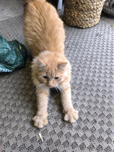Orange katt, trur det er hunkatt, liten og nett. Fin i pelsen så har nok ikke vært så lenge på egenhånd. Dukket opp på trappa vår etter Halloween. Kan ha fulgt etter noen unger? Utrolig kosete. Selvom vi forsøkte å overse og ikke ta på den, løp den mot oss of slang seg ned forran bena og ville ha kos. Den ligger på trappa og vil ikke forlate oss, selvom vår veldig teritorielle Bengal knurrer og prøver å skremme. 🫣