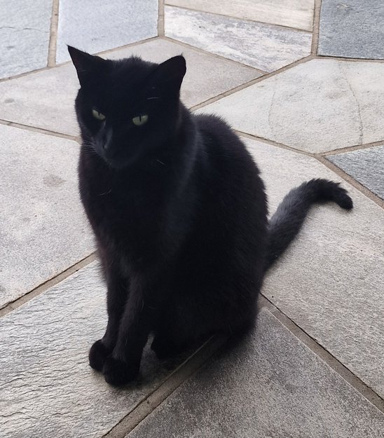 Helt sort, med noe få hvite hår her og der i pelsen. Mjauer kjempe høyt og lenge. Glad i andre katter. Litt skeptisk til barn.