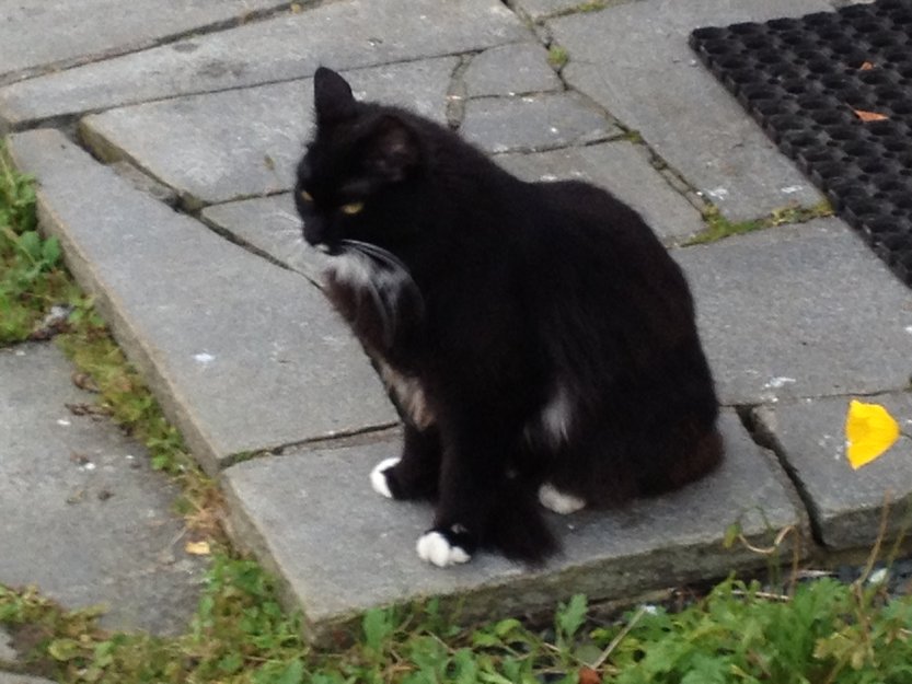 Svart katt med hvite labber har oppholdt seg i hagene i dette strøket i flere måneder. Kommer på døren hver kveld for å få mat, og vil gjerne komme innendørs. Mjauer for å få oppmerksomhet. Hvit på brystet og bena med gule/grønne øyne.